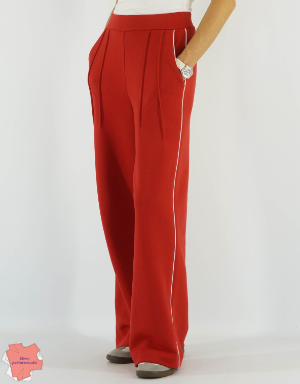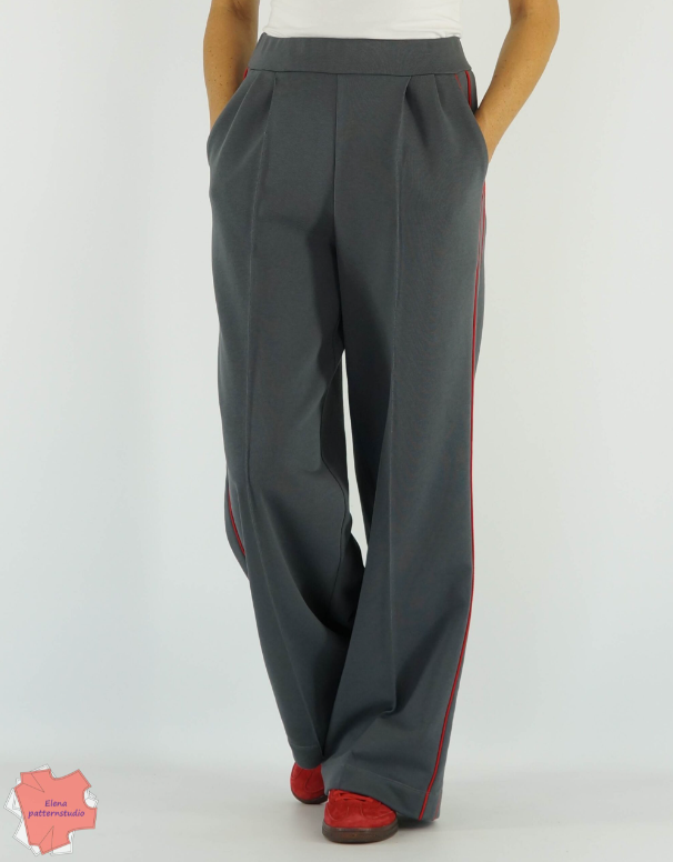 Выкройка трикотажных брюк умеренного объема прямого силуэта на притачном поясе с резинкой. Середина пояса находится на уровне естественной талии. Брюки с боковыми вставками. На передних половинках брюк карманы с отрезным бочком, застрочены стрелки и заложено по 2 складки. Один складка вертикальная, вторая – под небольшим углом. На задних половинках – вытачки. Боковые швы и швы карманов оформлены кантом.