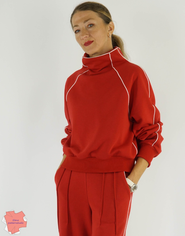 Выкройка трикотажного свитшота умеренного объема немного зауженного к низу силуэта. Рукава реглан, двухшовные. Низ рукавов обработан манжетами. Воротник – цельнокроенная стойка, обработана обтачкой. По низу изделия – притачной пояс. Швы изделия оформлены кантом. Длина свитшота выше уровня бедер.